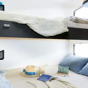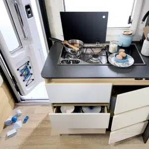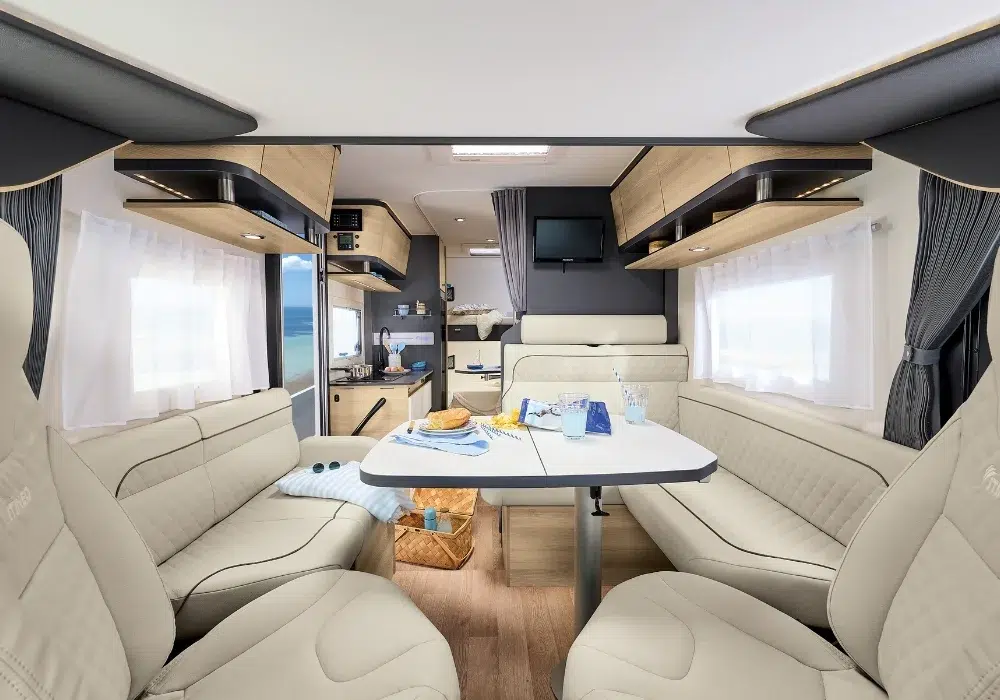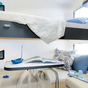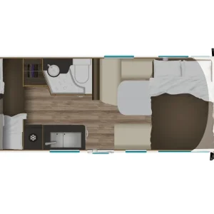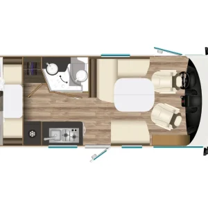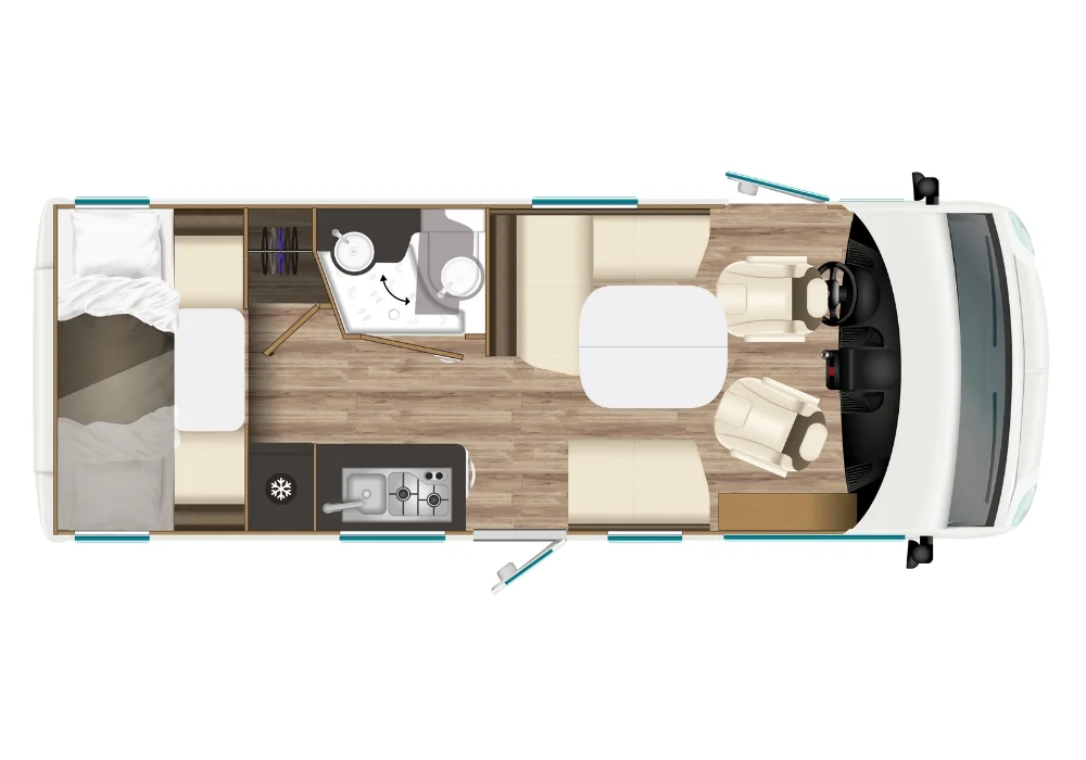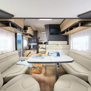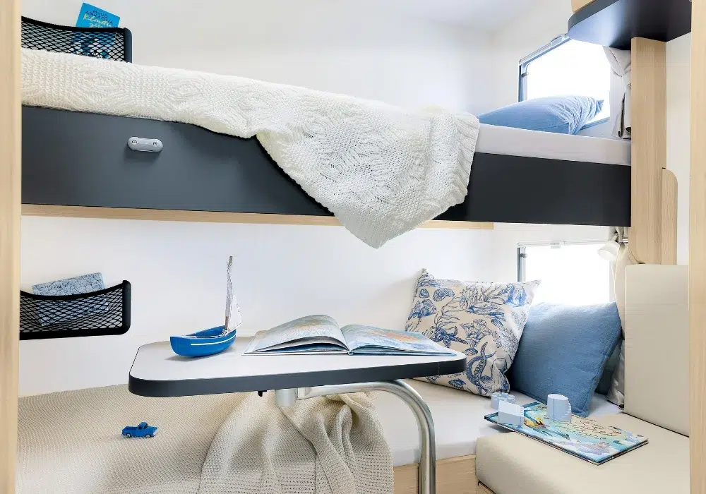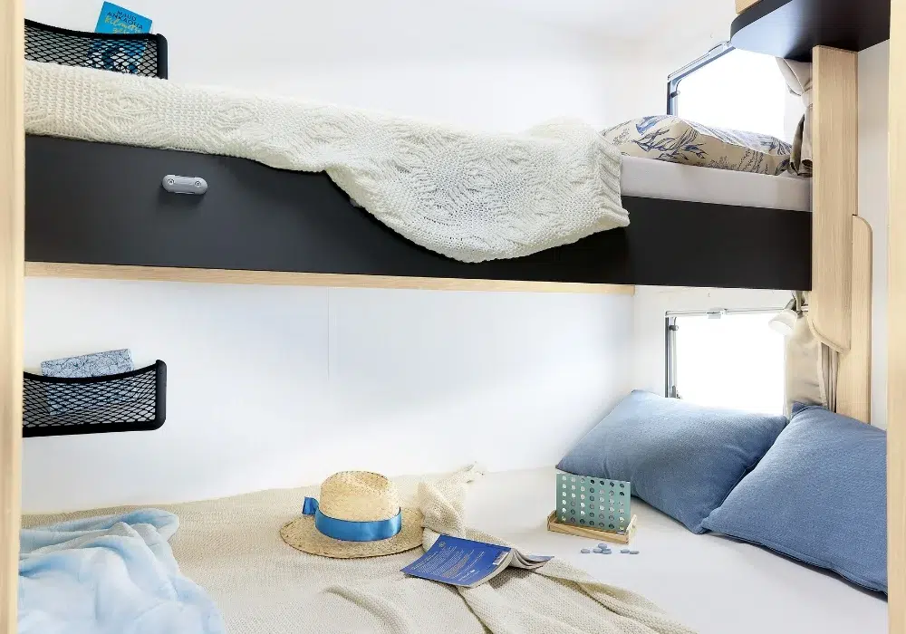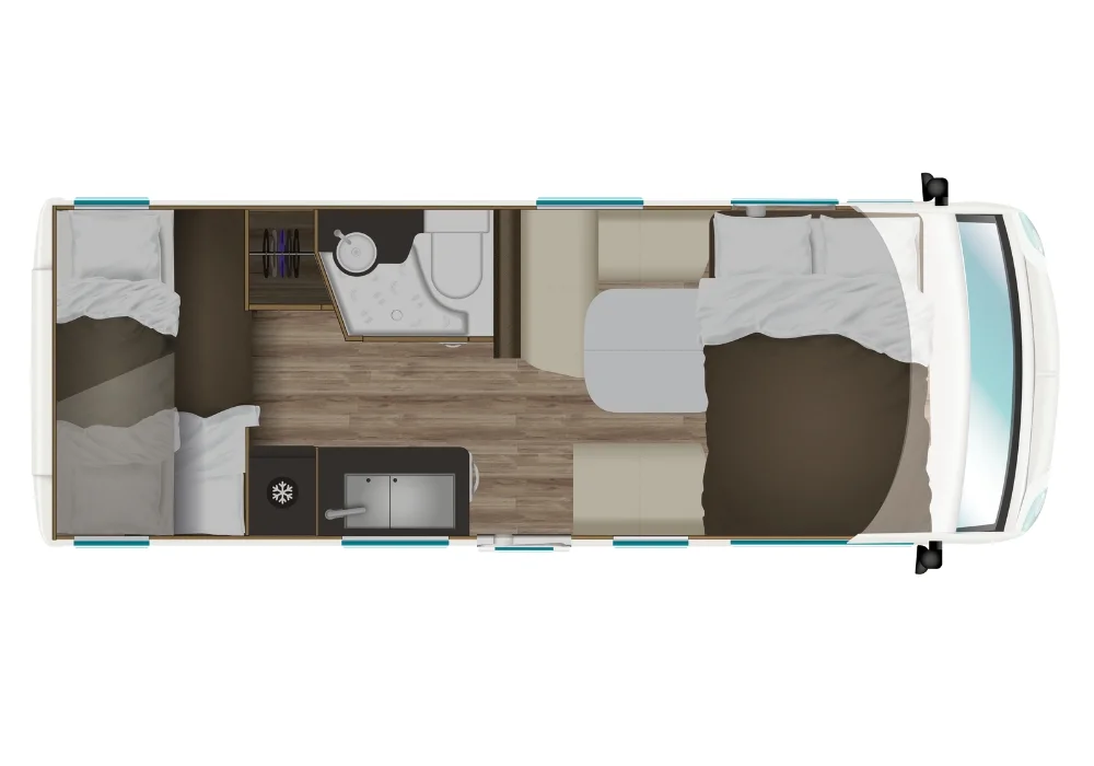 Кемперът разполага с две етажни легла (70 x 202 см), трансформиращо се двойно легло в трапезарията (133 см ширина) и хъббет над кабината (140 x 188 см).