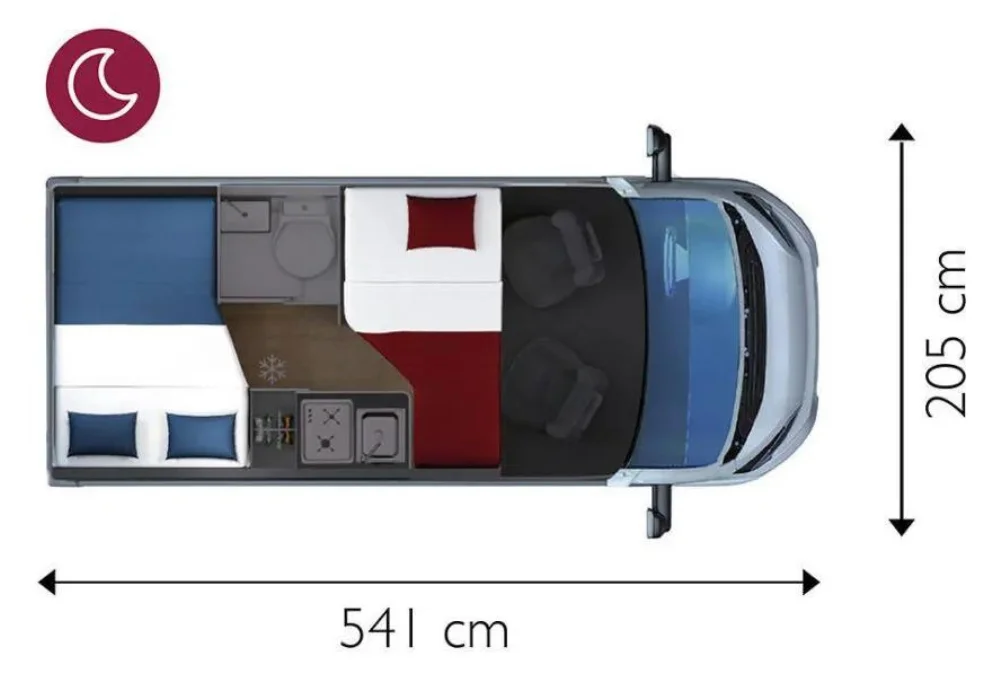 Кемперът предлага общо 2+1 спални места – удобен за двама възрастни и едно дете.