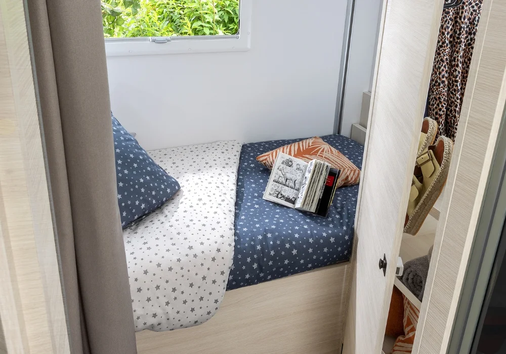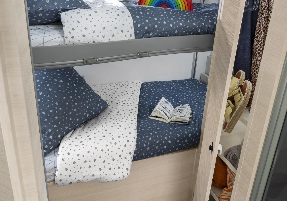 Challenger 380 разполага с електрическо падащо легло, двуетажно легло в задната част и допълнително легло в трапезарията, което осигурява комфорт за цялото семейство.