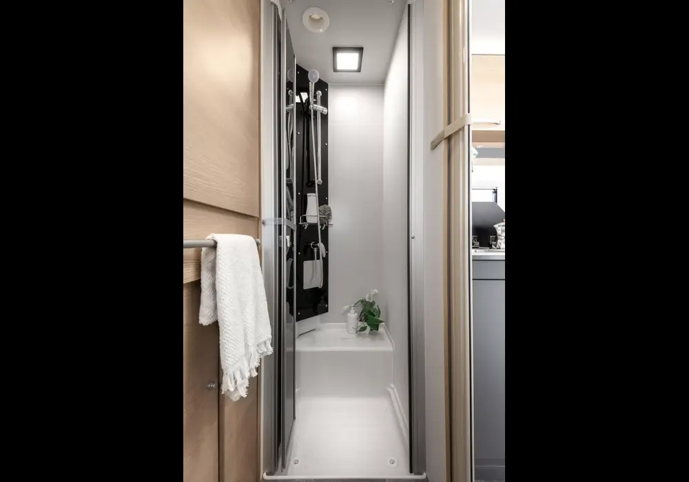 Този модел предлага просторна lounge дневна с разтегателна централна маса, голям гардероб в задната част и елегантен автоматичен хладилник.