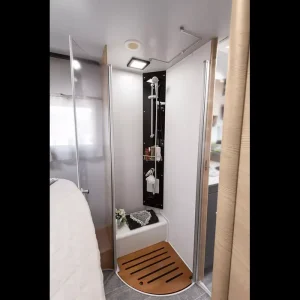 Този модел предлага плъзгаща се преграда между дневната и спалнята зона, практично място за съхранение под леглото и просторна самостоятелна душ кабина.